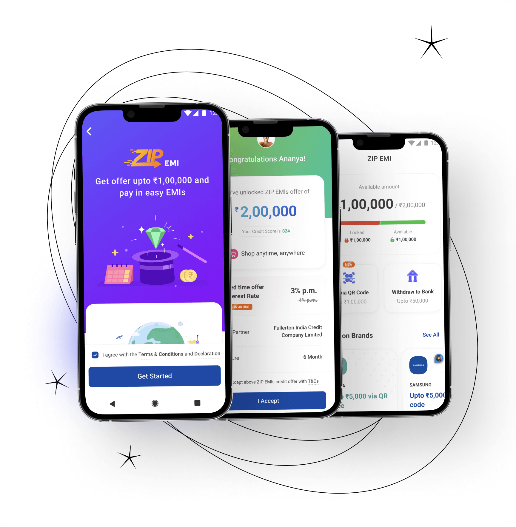 ZIP EMI is a credit line of upto 5 lakhs offered by our lending partners where the amount can be withdrawn to your bank account with repayment tenure of upto 24 months.